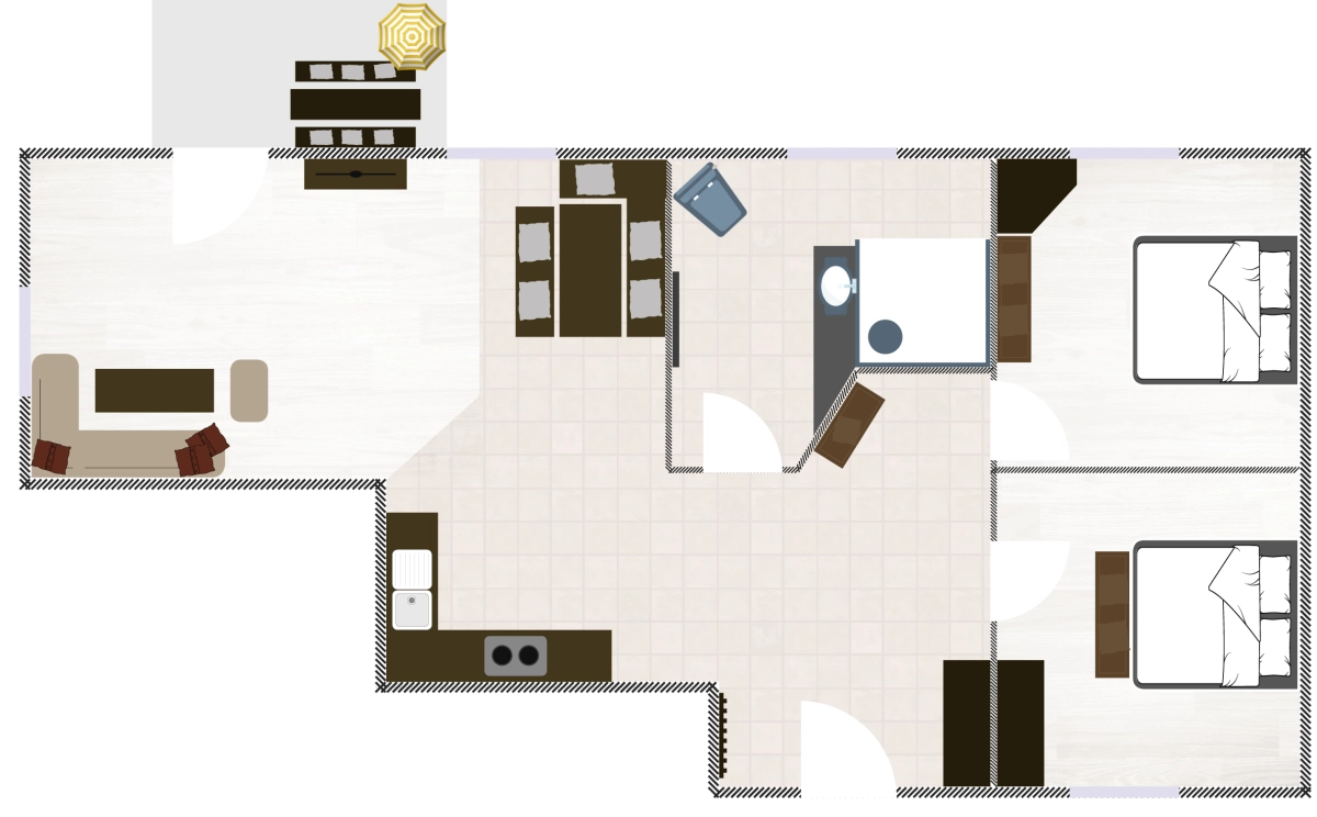 Die ebenerdige, schwellenfreie Wohnung ist auch für Gäste mit Rollstuhl geeignet. Sie verfügt über einen offenen Wohn- und Essbereich, zwei separate Schlafzimmer, ein modernes Badezimmer und eine komplett ausgestattete Küche.