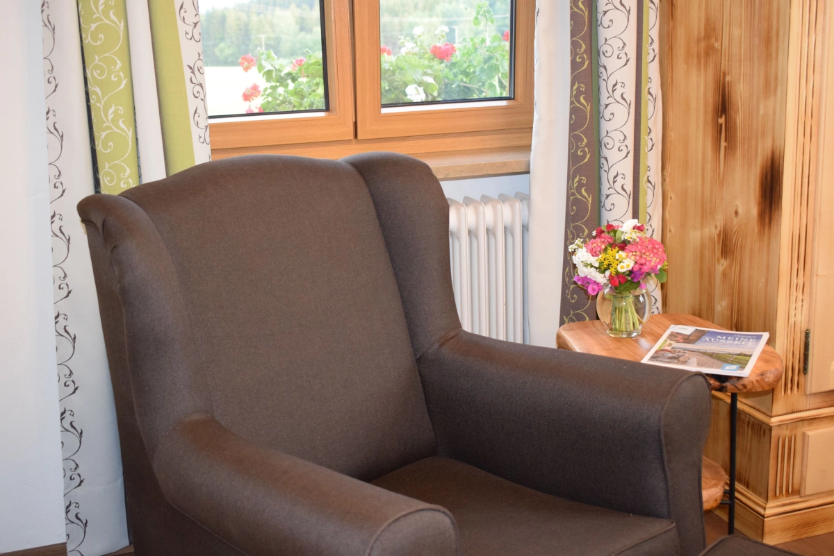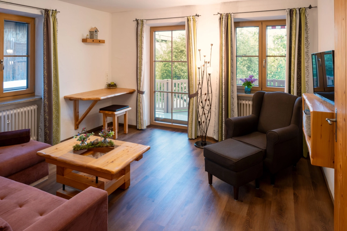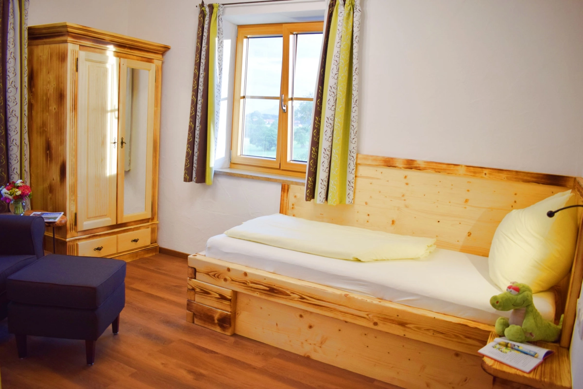 Auf dem großen Balkon mit Sitzgruppe und Sonnenschutzmarkise genießen Sie einen fantastischen Panoramablick auf die Berge, die hofeigenen Wiesen und den Spielplatz – ideal für Eltern, die ihre Kinder im Blick behalten möchten. Zwei Doppelzimmer und ein Einzelzimmer (alle mit Verdunklungsmöglichkeiten) bieten Platz und erholsamen Schlaf, auch tagsüber. Eines der Doppelzimmer ist zusätzlich mit eigenem TV und separatem WC ausgestattet.
