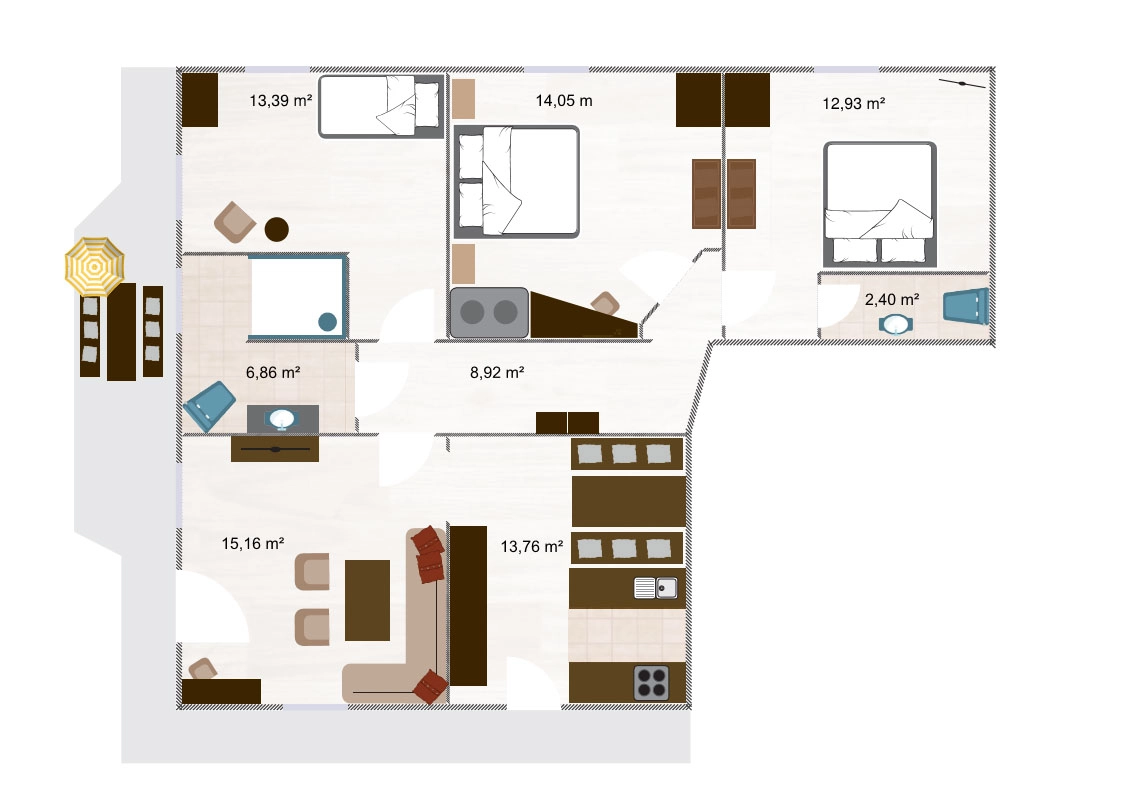 Der Grundriss der Ferienwohnung Baumkrone zeigt einen großzügig geschnittenen Wohn- und Essbereich mit viel Platz für die ganze Familie. Helle Räume, durchdachte Aufteilung und direkter Zugang zum Balkon machen ihn zum Mittelpunkt Ihres Urlaubs.